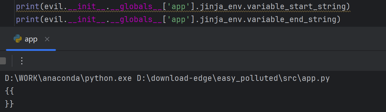 print(Evil.__init__.__globals__['app'].jinja_env.variable_start_string)